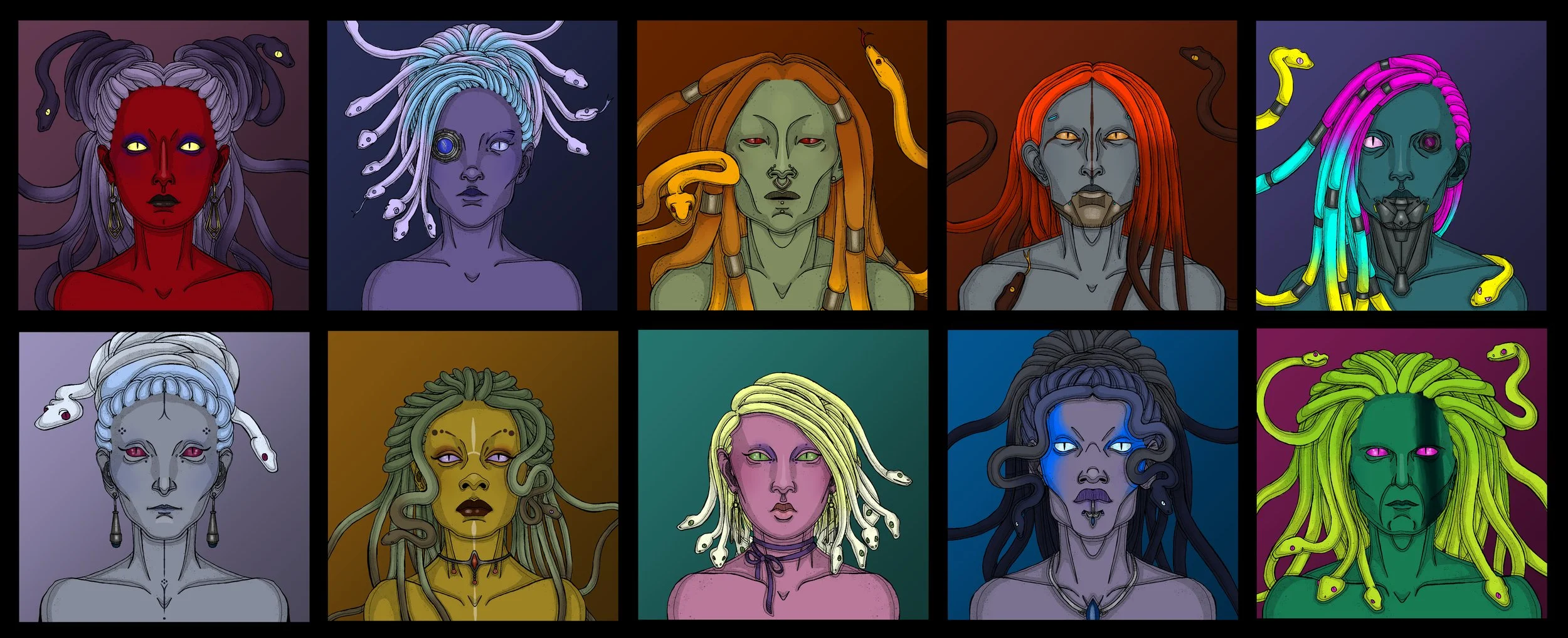 The player is the Gorgon rebel leader for the very controversial thirteenth Zodiac constellation, Opiuchus. I love cosmetics in games, so imagining this as a game with a full character creator, there would be options for facial features, as well as makeup, tattoos, scars, eye colour, tech augments and jewellery. Makeup and jewellery would all be colour adjustable because details matter a lot. There would be options for Gorgon hairstyles as well, but the colours of the snake hair would be limited to ten options that are tied to damage types.